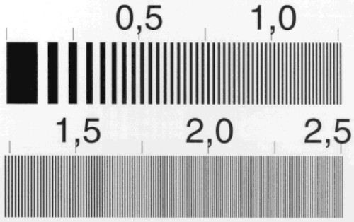Stellen wir uns nun die Frage, wann die Sensorauflösung beider Modelle zu 100 % genutzt, bzw. dargestellt werden kann. Dieses Glück tritt ein, sobald das Objektiv benachbarte Pixel stets mit unterschiedlichen Informationen versorgen kann. Kaum ein reales Motiv vermag dies zu leisten aber es beschreibt ein Extrem. Objektivtestbilder bilden dieses Extrem ab. In einer Abfolge aus immer dichter werdenden Linien verdeutlichen sie den Punkt, ab dem der Sensor keine weißen und schwarzen Linien mehr unterscheiden kann. Dieser Punkt korreliert schließlich mit einer Auflösung, welche in Linienpaaren pro Millimeter angegeben wird.