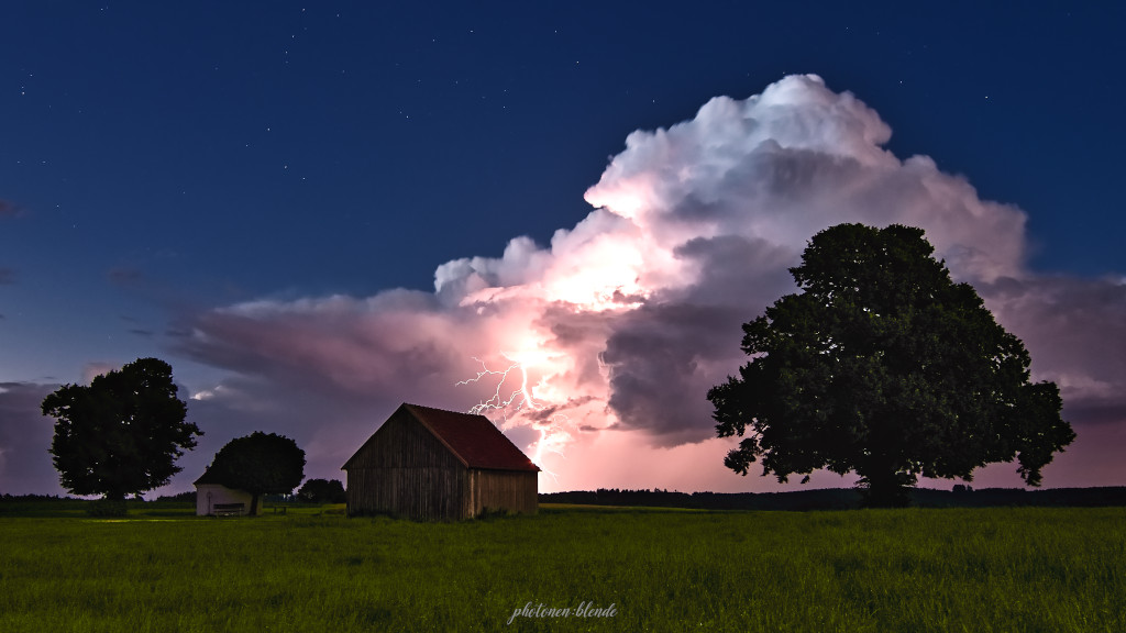 Bei den nun erreichten 118 cm ist längst noch nicht Schluss. Werden zusätzlich die kleinen Beinsegmente ausgefahren, nimmt die Stabilität zwar etwas ab, dank 11 Lagen Kohlefaserfließ und 13 mm Beindurchmesser, bleibt das Stativ aber insgesamt gut nutzbar (mittlerer Aufbau im obigen Bild). 140 cm misst der Meterstab jetzt vom Boden bis zur Bodenplatte der Kamera. Donnert es einmal heftiger, können Schwingungen mit etwas Gewicht am Haken der Mittelsäule – z.B. einem Fotorucksack – effektiv unterbunden werden. Was in dieser Konfiguration möglich ist, habe ich bei einem aufziehenden Gewitter getestet. Das Lens-Aid Pro Carbon musste dabei das Alpenvorland für 20 s festhalten … .