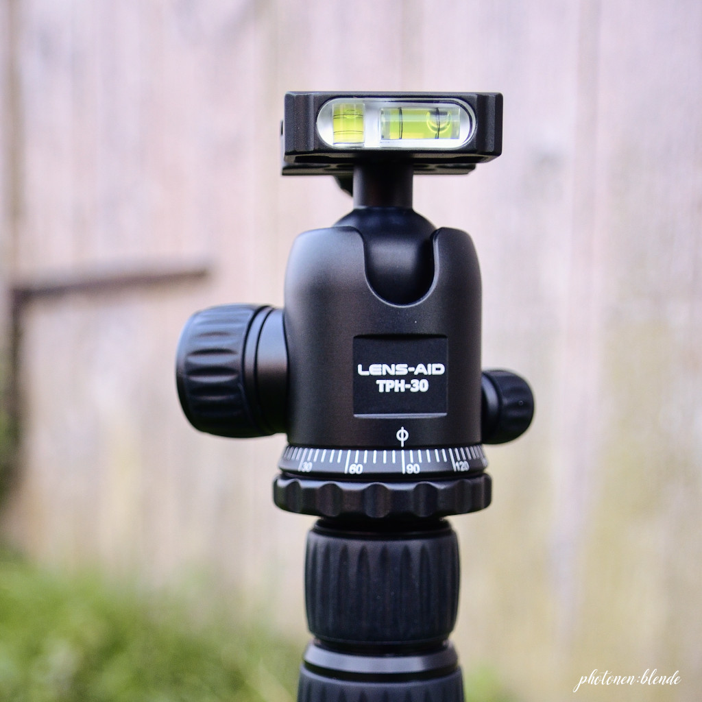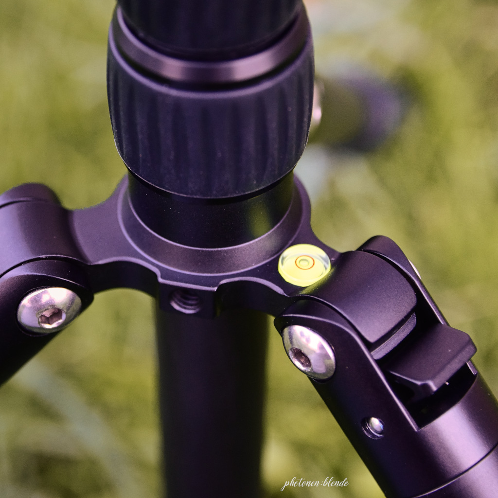 Puren Genuss bieten die Verstellhebel für die drei Stativbeine sowie die Lock-Ringe. Sie arretieren unaufgeregt und ohne mechanisches Haken in drei Positionen, so gefällt mir das. Auf der Stativschulter hat Lens-Aid eine Wasserwaage platziert, wodurch sich die Panoramadrehachse für den Kugelkopf optimal justieren lässt. Ein kleines aber feines Feature!